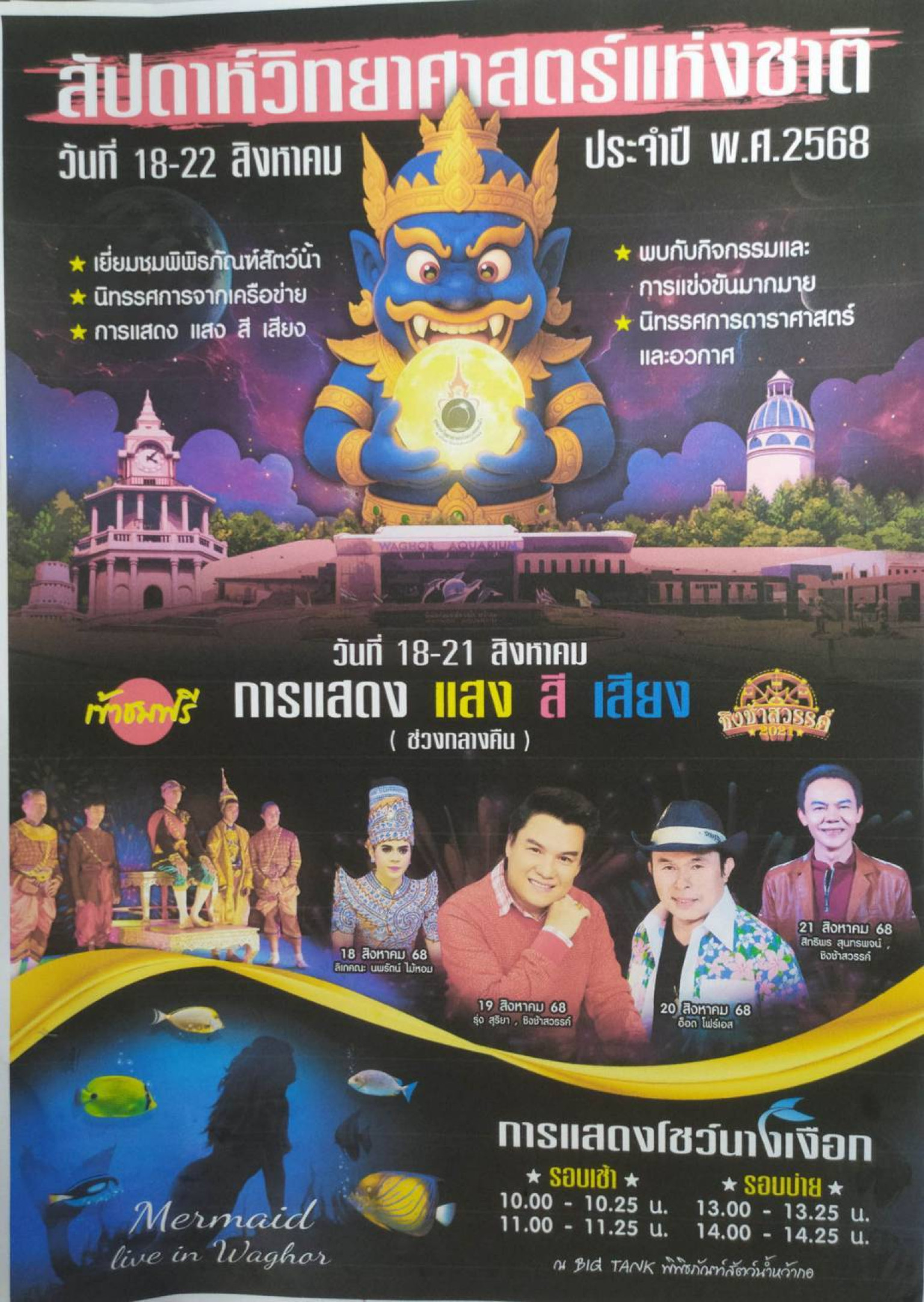 โดยกิจกรรมภาคกลางวัน วันที่ 18 ส.ค. ในช่วงเช้าจัดให้มีพิธีวางพานพุ่มถวายราชสักการะ ณ ลานพระบรมราชานุสาวรีย์ รัชกาลที่ 4 จากนั้นจะมีพิธีเปิดงานสัปดาห์วิทยาศาสตร์แห่งชาติ และกิจกรรมการแข่งขันยิงจรวดขวดน้ำ ประเภทแม่นยำ แบ่งออกเป็น 3 ระดับ ได้แก่ ระดับประถมศึกษา -มัยมศึกษา และระดับนักศึกษา สกร. โดยจัดกิจกรรม ณ บริเวณ อาคารฟากฟ้า หว้ากอ นอกจากนี้ยังมีกิจกรรมแรลลี่วิชาการ โดยจะมีกิจกรรมดังนี้ 1.กิจกรรมจากแต่หน่วยงานที่มาร่วมจัดนิทรรศการ อาทิเช่น ท้องฟ้าจำลองกรุงเทพ ศูนย์วิทยาศาสตร์นครราชสีมา ศูนย์วิทยาศาสตร์พิษณุโลก สำนักงานพลังงานจังหวัด ศูนย์วิจัยทรัพยากรทางทะเลและชายฝั่งอ่าวไทยตอนบน จ.ชุมพร ศูนย์การเรียนรู้ กฟผ.ทับสะแก และสำนักงานทรัพยากรทางชายฝั่ง จ.เพชรบุรี โดยจัดแสดงนิทรรศการที่บริเวณด้านหลังอาคารพิพิธภัณฑ์สัตว์น้ำหว้ากอ 2.กิจกรรมนวัตกรรมภูมิปัญญา เป็นกิจกรรม Workshop (เวิร์คช็อป) ที่เกี่ยวกับภูมิปัญญาท้องถิ่นใน 3 จังหวัด ได้แก่ เพชรบุรี ประจวบฯ และชุมพร ทำสบู่และประกอบอาหารยำสาหร่าย จัดกิจกรรม ณ บริเวณด้านหน้าฐานการเรียนรู้ระบบนิเวศฯ 3.กิจกรรมลานละเล่น ประกอบด้วยกิจกรรมย่อย จำนวน 3 กิจกรรม คือลานประลอง ลานบอร์ดเกมส์ และลานOzobot (โอโซบอต) จัดกิจกรรม ณ อาคารคาราศาสตร์และอวกาศ และกิจกรรมค่ายวิทยาศาสตร์ ณ หว้ากอ ครั้งที่ 41 "ตามรอยพระยุคลบาท พระบิดาแห่งวิทยาศาสตร์ จัดโดย สมาคมวิทยาศาสตร์แห่งประเทศไทยในพระบรมราชูปถัมภ์ องค์การพิพิธภัณฑ์วิทยาศาสตร์แห่งชาติ(อพวช.) ร่วมกับ อวจ. ระหว่างวันที่ 17-19 สิงหาคม 2568 ณ ค่ายหว้ากอ