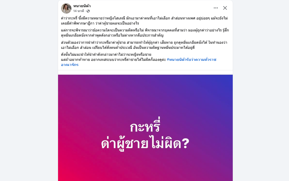 อ่านข่าวต้นฉบับได้ที่ : ทนายนิด้า แจงข้อกฎหมายชัดๆ ด่าผู้ชายแรงๆ ว่า กะXรี่ คนด่าผิดหรือไม่