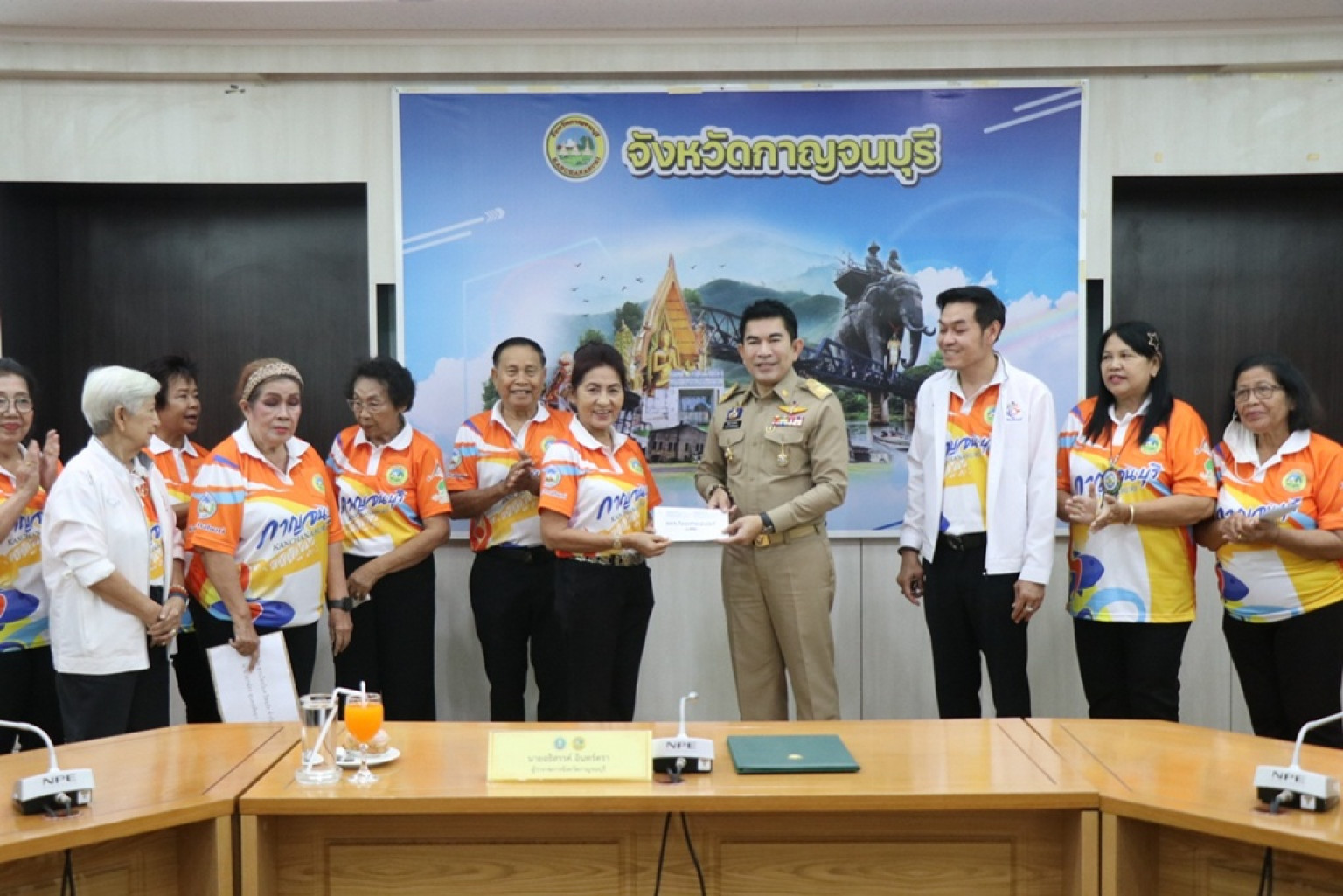 ผวจ.กาญจนบุรี ให้โอวาทและมอบเงิน เพื่อเป็นขวัญกำลังใจให้แก่คณะนักกีฬาผู้สูงอายุและเจ้าหน้าที่ตัวแทนจังหวัดกาญจนบุรี ที่เป็นตัวแทนเข้าร่วมการแข่งขันกีฬาและนันทนาการผู้สูงอายุแห่งประเทศไทย ครั้งที่ 17 “โคราชเกมส์”