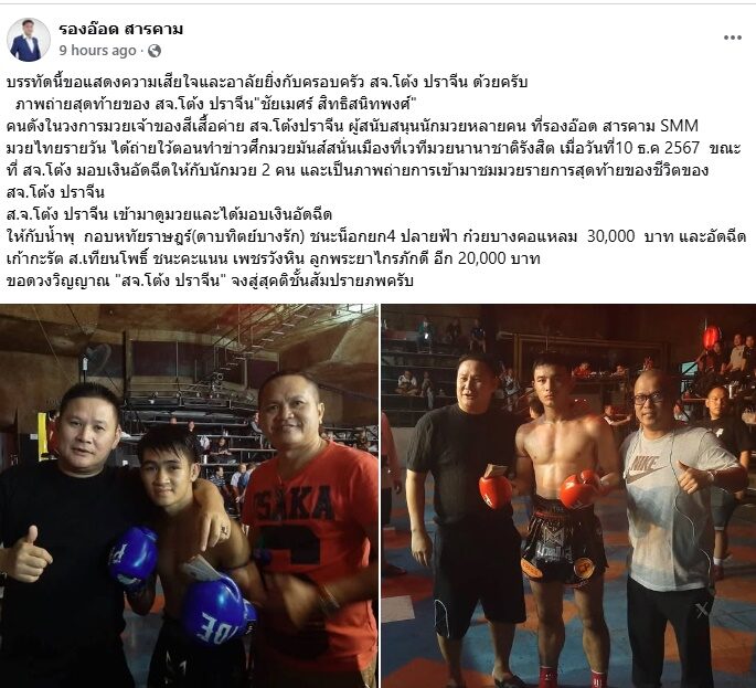 เปิดภาพสุดท้าย สจ.โต้ง ปราจีน ในเวทีมวย มอบอัดฉีดให้กับนักมวย 2 คน ก่อนถูกยิงเสียชีวิต ในบ้านพักพ่อบุญธรรม สุนทร วิลาวัลย์