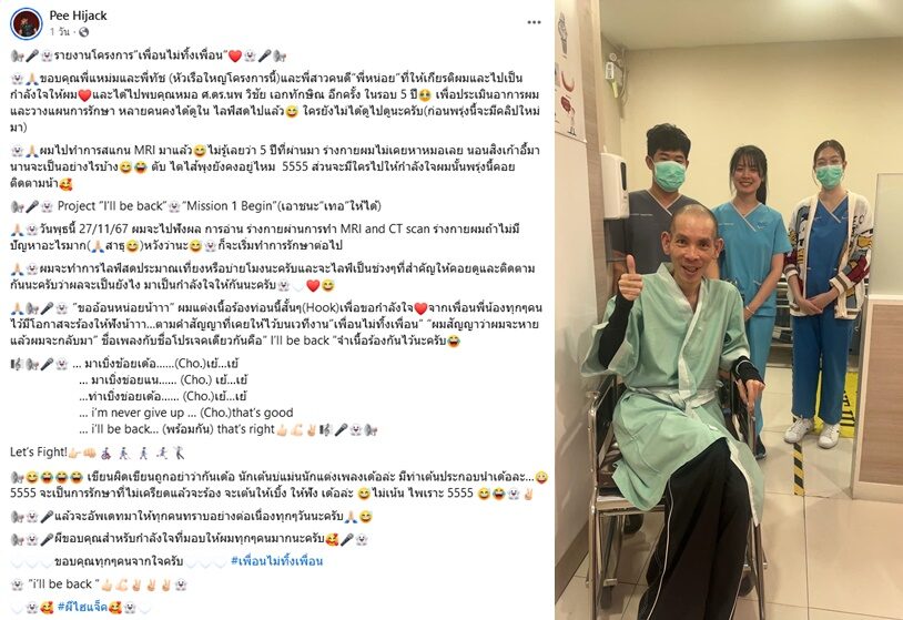 ขณะที่ เจ้าตัวโพสต์ยาวก่อนหน้านั้น เล่าถึงการออกมาพบหมออีกครั้งในรอบ 5 ปีว่า “ รายงานโครงการ “เพื่อนไม่ทิ้งเพื่อน” ขอบคุณพี่แหม่มและพี่ทัช (หัวเรือใหญ่โครงการนี้)และพี่สาวคนดี“พี่หน่อย”ที่ให้เกียรติผมและไปเป็นกำลังใจให้ผม และได้ไปพบคุณหมอ ศ.ดร.นพ วิชัย เอกทักษิณ อีกครั้ง ในรอบ 5 ปี เพื่อประเมินอาการผมและวางแผนการรักษา หลายคนคงได้ดูใน ไลฟ์สดไปแล้ว ใครยังไม่ได้ดูไปดูนะครับ(ก่อนพรุ่งนี้จะมีคลิปใหม่มา)”