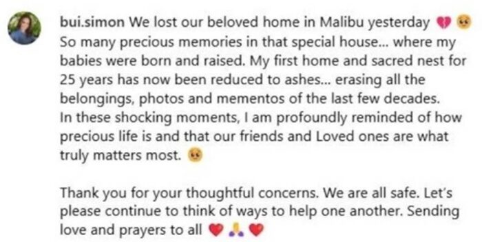 ด้าน ปุ๋ย ภรณ์ทิพย์ ก็โพสต์ในไอจีว่า “ได้สูญเสียบ้านที่รักที่มาลิบูไปแล้ว ความทรงจำอันล้ำค่ามากมายที่บ้านพิเศษหลังนั้น ที่ลูกๆ เกิดและเติบโต บ้านหลังแรกและเป็นรังศักดิ์สิทธิ์ของฉันในรอบ 25 ปี ตอนนี้กลายเป็นเถ้าถ่าน ทุกอย่างถูกลบไปหมด ทั้งข้าวของ รูปถ่าย ของที่ระลึก ทั้งหมดในช่วง 2-3 ทศวรรษที่ผ่านมา ”