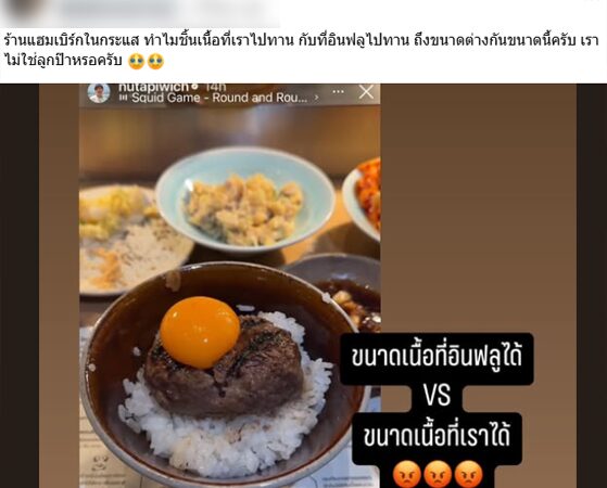 โดยสมาชิกรายได้กล่าวได้นำภาพข้าวหน้าเนื้อแฮมเบิร์กทั้ง 2 จาน มาเปรียบเทียบกันพร้อมระบุข้อความว่า ร้านแฮมเบิร์กในกระแส ทำไมชิ้นเนื้อที่เราไปทาน กับที่อินฟลูไปทาน ถึงขนาดต่างกันขนาดนี้ครับ เราไม่ใช่ลูกป๊าหรอครับ