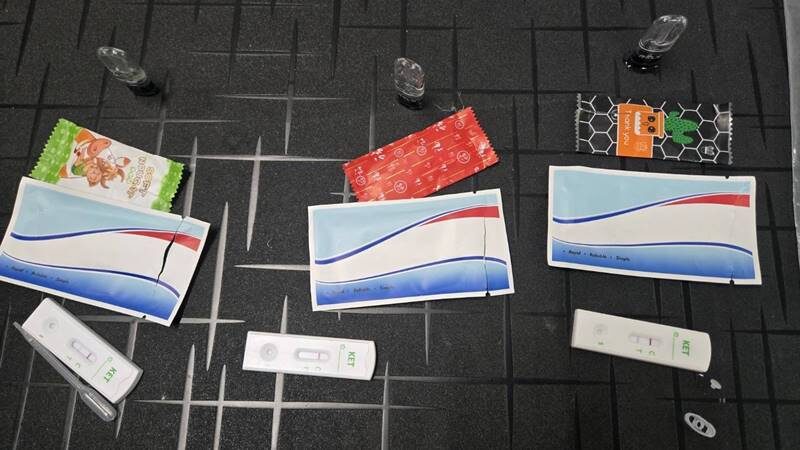 เครื่องชั่งน้ำหนักดิจิตอล 2 เครื่องหัวน้ำยาบุหรี่ไฟฟ้า(พอตเค) มีส่วนผสมเคตามีนบรรจุในห่อสีเขียว 145 หัว หัวน้ำยาบุหรี่ไฟฟ้า(พอตเค) มีส่วนผสมเคตามีนบรรจุในห่อสีแดง 24 หัว พอตเค รวม 201 หัว หัวน้ำยาบุหรี่ไฟฟ้า(พอตเค) มีส่วนผสมเคตามีนบรรจุในห่อสีดำ 32 หัว ซองบรรจุพัสดุกันกระแทก สีฟ้า 16 ซอง