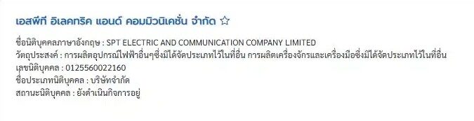 บริษัท เอสพีที อิเลคทริค แอนด์ คอมมิวนิเคชั่น จำกัด (SPT ELECTRIC AND COMMUNICATION COMPANY LIMITED) จดทะเบียนเมื่อวันที่ 17 ส.ค. 2560 ปัจจุบันทุนจดทะเบียน 100,000 บาท พบรายชื่อฟิล์ม รัฐภูมิ ถือหุ้นถือจำนวน 4,950 หุ้น (49.50%) มูลค่าหุ้น 19,800 บาท ดำเนินธุรกิจผลิตอุปกรณ์ควบคุมและจ่ายไฟฟ้า ตามผลประกอบการดังนี้