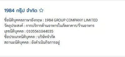 เริ่มด้วยบริษัท 1984 กรุ๊ป จำกัด (1984 GROUP COMPANY LIMITED) จดทะเบียนเมื่อ วันที่ 9 มี.ค. 2561 ปัจจุบันทุนจดทะเบียน 1,000,000 บาท