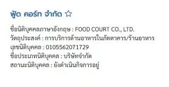 บริษัท ฟู้ด คอร์ท จำกัด (FOOD COURT CO., LTD.) จดทะเบียนเมื่อวันที่ 19 เม.ย. 2562 ทุนจดทะเบียนปัจจุบัน 1,000,000 บาท พบฟิล์ม รัฐภูมิ ถือหุ้นจำนวน 4,000 หุ้น (40.00%) มูลค่าหุ้น 0 บาท ดำเนินธุรกิจประกอบธุรกิจให้จำหน่าย อาหาร เครื่องดื่ม