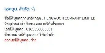 และบริษัท เฮงวูน จำกัด (HENGWOON COMPANY LIMITED) จดทะเบียนเมื่อวันที่ 16 ส.ค. 2550 ทุนจดทะเบียนปัจจุบัน 1,000,000 บาท พบรายชื่อนายรัฐภูมิ โตคงทรัพย์ เป็นหนึ่งในคณะกรรมการบริษัท ดำเนินธุรกิจผลิตสื่อโฆษณา ตามผลประกอบการดังนี้
