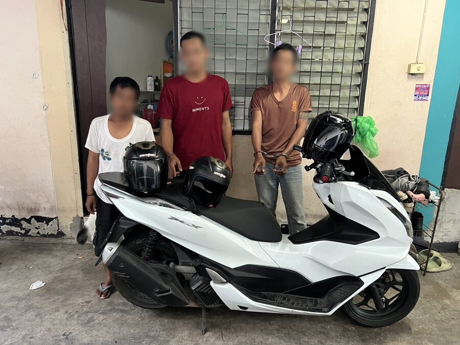 จับกุม นายอัสนัน (สงวนนามสกุล) อายุ 24 ปี นายซัมกี (สงวนนามสกุล) อายุ 23 ปี นายซัมรี (สงวนนามสกุล) อายุ 35 ปี นายมีซี (สงวนนามสกุล) อายุ 33 ปี นายอัสฮา (สงวนนามสกุล) อายุ 32 ปี พร้อมด้วยของกลาง เสื้อยืดแขนยาวสีแดง ยี่ห้อ GILDAN 1 ตัว เสื้อยีนส์แขนยาว ยี่ห้อ ลีวาย สีน้ำเงิน 1 ตัว หมวกนิรภัยสีดำ ยี่ห้อ SPACE CROWN 1 ใบ หมวกนิรภัยสีดำ ยี่ห้อ SPACE CROWN ไม่มีกระจกบังลม จำนวน 1 ใบ กรรไกรด้ามสีเหลือง 1 เล่ม