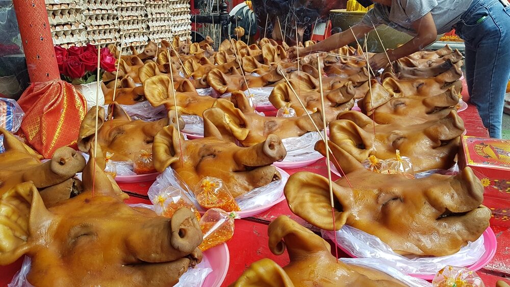ทั้งนี้นำสร้อยคอทองคำแท้หนัก 1 บาท หัวหมูจำนวน 99 หัวและ ข้าวสารจำนวน 99 ถุง ไข่ไก่ต้ม 5,000 ฟอง หลังจากประสบผลสำเร็จขายที่ดินได้ จึงเดินทางมาทำการแก้บนกับพระเงินพระทอง ตาทองงิ้วราย จากนั้นนำสิ่งของวางเรียงรายที่บริเวณลานด้านหน้าสิ่งศักดิ์สิทธิ์ พร้อมทั้งจุดธูปบอกกล่าวเทพเทวดา และนำธูปปักกับสิ่งของ หัวหมู ไข่ไก่เพื่อทำการแก้บน