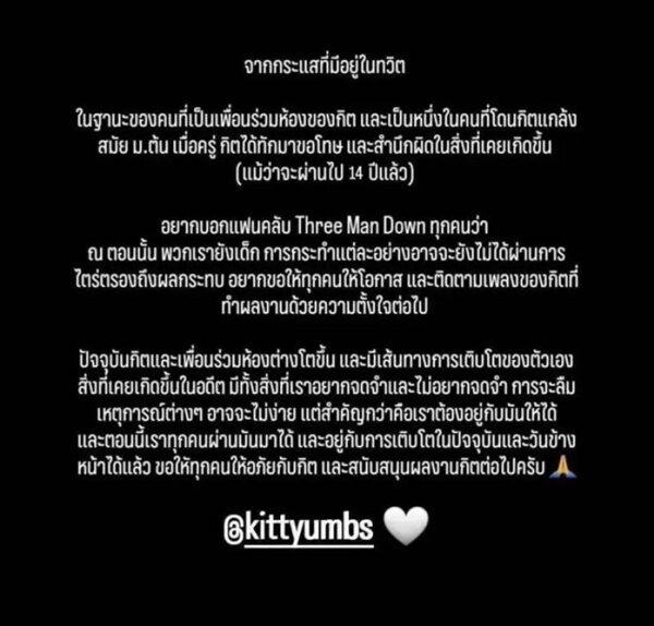 “จากกระแสที่อยู่ในทวิตเตอร์ ในฐานะของคนที่เป็นเพื่อนร่วมห้องของกิต และเป็นหนึ่งในคนที่โดนกิตแกล้ง สมัย ม.ต้น เมื่อครู่กิตได้ทักมาขอโทษ และสำนึกผิดในสิ่งที่เคยเกิดขึ้น (แม้ว่าจะผ่านไป 14 ปีแล้ว)