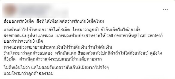 อย่างไรก็ดี เธอเผย "ไม่คืนเงินไม่ว่า แต่ไม่ยอมรับเลยว่ามันเกิน3เม็ดมากไปจริงๆ แถมโทรมาว่าลูกค้าสองรอบ" พร้อมทั้งสอบถามความคิดเห็นชาวเน็ตว่าในภาพดังกล่าว'คิดว่าพริก 3 เม็ดจริงไหม?'