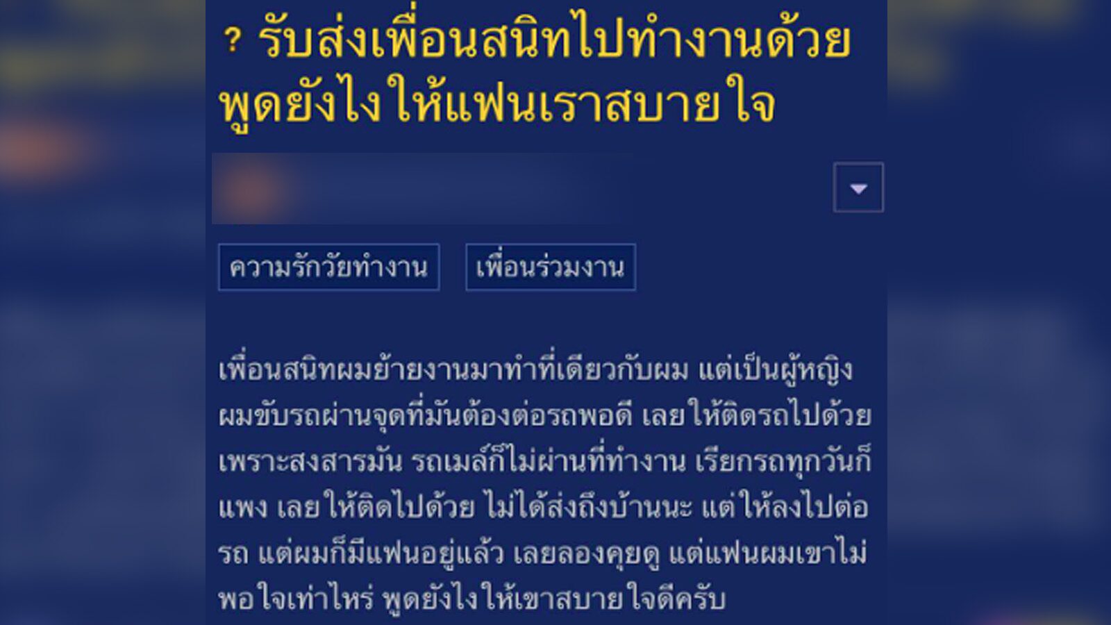 เมื่อวันที่ 19 กรกฎาคม ที่ผ่านมา สมาชิกพันทิปรายหนึ่งได้ตั้งกระทู้ปรึกษาปัญหาชีวิต เมื่อเพื่อนสนิทย้ายมาทำงานที่เดียวกัน เขาจึงแสดงน้ำใจด้วยการให้เพื่อนติดรถมาด้วย ควรพูดอย่างไรให้แฟนเข้าใจดี เพราะเพื่อนสนิทที่ว่าดันเป็น "ผู้หญิง"
