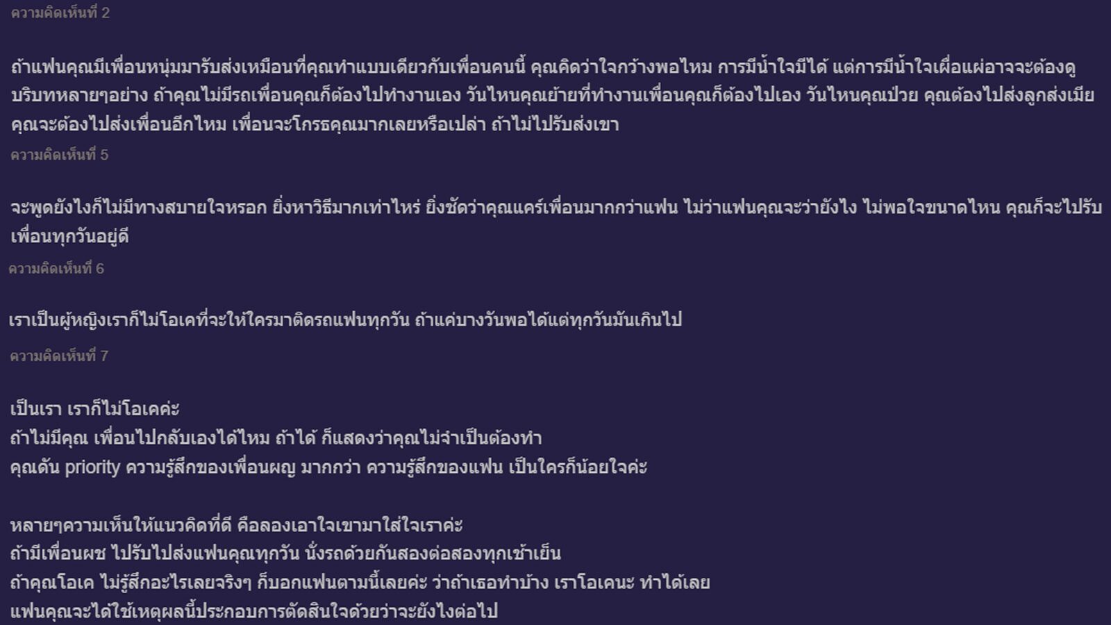 สำหรับความคิดเห็นอื่นๆ นั้นมองว่า ไม่ว่าเจ้าของกระทู้จะพูดอย่างไร แฟนก็ไม่มีทางสบายใจขึ้น เพราะยิ่งหาวิธีมากเท่าไหร่ ยิ่งบ่งบอกว่าเจ้าของกระทู้แคร์เพื่อนมากกว่าแฟน มีน้ำใจกับเพื่อนได้แต่ควรรักษาระยะห่างบ้าง