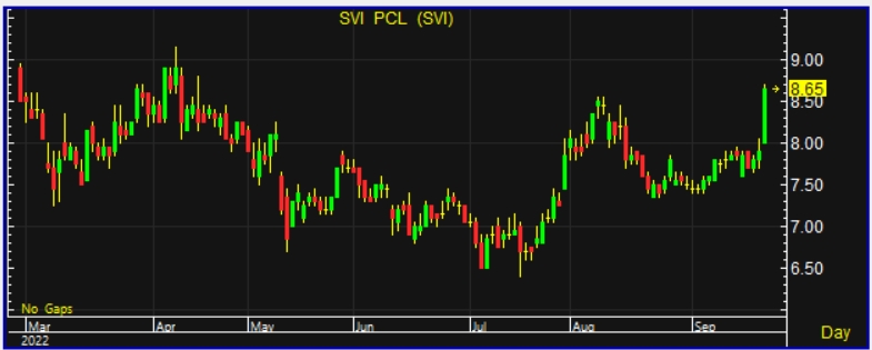 ผู้สื่อข่าวรายงานว่า วันนี้(20ก.ย.65) ราคาหุ้นบริษัท เอสวีไอ จำกัด (มหาชน) หรือ SVI ณ เวลา 15:47 น. อยู่ที่ระดับ 8.65 บาท บวก 0.75 บาท หรือ 9.49% ราคาสูงสุดอยู่ที่ 8.70 บาท ราคาต่ำสุดอยู่ที่ 8.00 บาท ด้วยมูลค่าซื้อขาย 194.88 ล้านบาท ราคาหุ้นนิวไฮในรอบ 5 เดือนโดยเทียบตั้งแต่หุ้นยืนที่ระดับ 8.90 บาท เมื่อวันที่ 8 เม.ย.65
