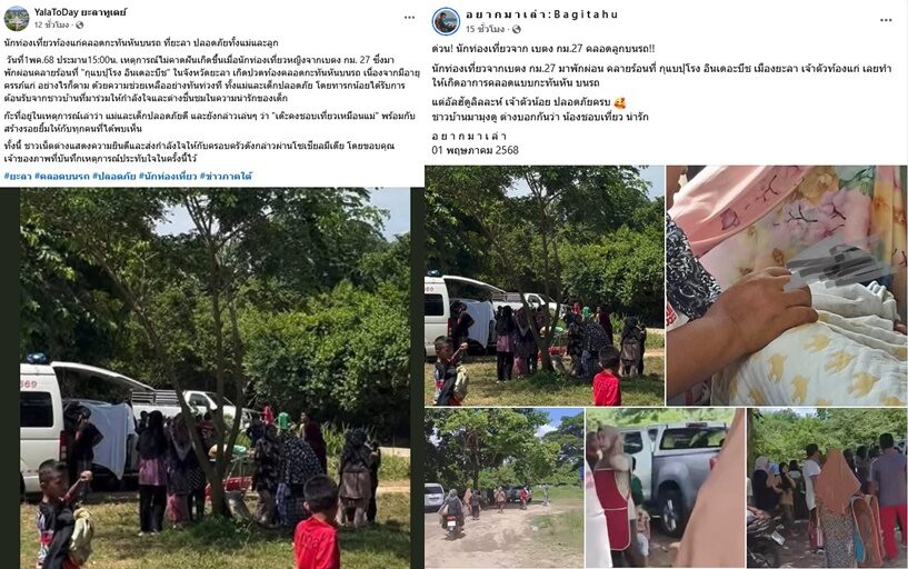 แห่ถามเลขทะเบียนสนั่น นักท่องเที่ยวสาว สุดอั้นปวดท้องคลอดลูกในรถแบบกะทันหัน ปลอดภัยทั้งแม่และลูก ชาวบ้านลุ้นให้กำลังใจต้อนรับทารกน้อยน่าเอ็นดูกลางสถานที่ท่องเที่ยวยะลา