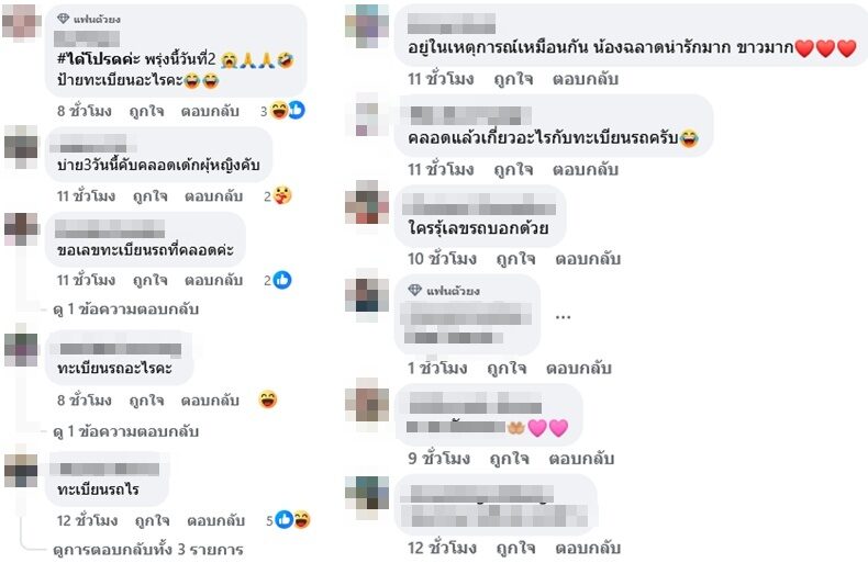 ขณะที่ชาวเน็ตแห่คอมเมนต์ขอเลขทะเบียนกันรัวๆ อาทิ #ได้โปรดค่ะ พรุ่งนี้วันที่2 ป้ายทะเบียนอะไรคะ , บ่าย3วันนี้คับคลอดเด็กผู้หญิงคับ , ขอเลขทะเบียนรถที่คลอดค่ะ , ทะเบียนรถอะไรคะ , อยู่ในเหตุการณ์เหมือนกัน น้องฉลาดน่ารักมาก ขาวมาก , ใครรู้เลขรถบอกด้วย เป็นต้น