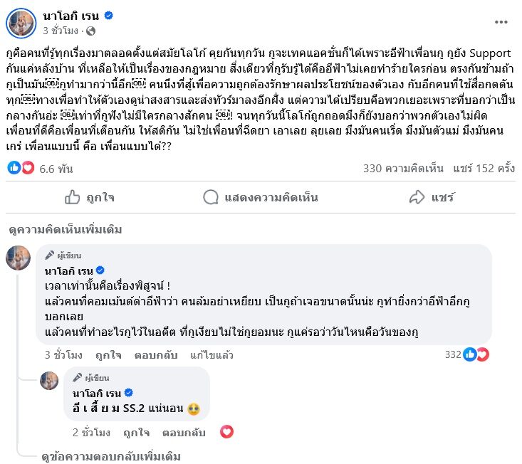“สิ่งเดียวที่กูรับรู้ได้คืออีฟ้าไม่เคยทำร้ายใครก่อน ตรงกันข้ามถ้ากูเป็นมัน กูทำมากว่านี้อีก คนนึงที่สู้เพื่อความถูกต้องรักษาผลประโยชน์ของตัวเอง กับอีกคนที่ใช้สื่อกดดันทุก ทางเพื่อทำให้ตัวเองดูน่าสงสารและส่งทัวร์มาลงอีกฝั่ง แต่ความได้เปรียบคือพวกเยอะเพราะที่บอกว่าเป็นกลางกันอ่ะ เท่าที่กูฟังไม่มีใครกลางสักคน ! จนทุกวันนี้โลโก้ถูกถอดมึงก็ยังบอกว่าพวกตัวเองไม่ผิด ”