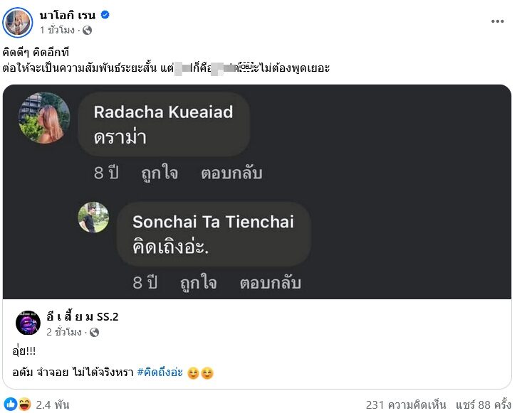 แถม นัส ยังแชร์โพสต์ของเพจ อี เ สี้ ย ม SS.2 ที่แคปแชท จอย กับ โปรกอล์ฟหนุ่ม แฟน ครูเบียร์ คนปัจจุบัน ซึ่งฝ่ายชายคอมเมนต์หวานว่าคิดถึงด้วย โดย นัส ระบุข้อความว่า “คิดดีๆ คิดอีกที ต่อให้จะเป็นความสัมพันธ์ระยะสั้น แต่yxxก็คือyxxค่ะไม่ต้องพูดเยอะ”