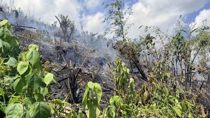 เจ้าของเข่าทรุด เผาหญ้าแห้ง ไฟลามเข้าสวนทุเรียนเพิ่งปลูกใหม่ ไหม้วอดกว่า 5 ไร่
