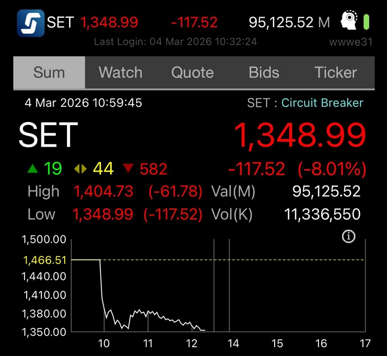 ตลาดหุ้นไทยหยุดพักซื้อขาย ตามมาตรการ Circuit Breaker แล้ว หลังดัชนีร่วงกว่า 117 จุด ดัชนี -8.01% กลับมาเทรดช่วงบ่าย