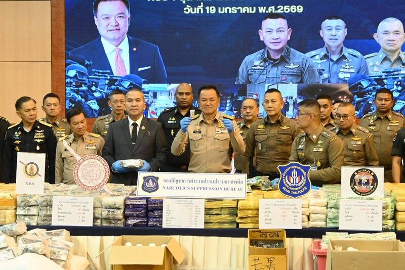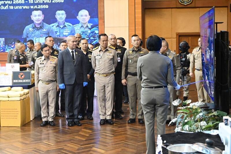 วันที่ 19 มกราคม 2569 ที่กองบัญชาการตำรวจปราบปรามยาเสพติด (บช.ปส.)นายอนุทิน ชาญวีรกูลนายกรัฐมนตรี และ รัฐมนตรีกระทรวงมหาดไทย พล.ต.ท.รุทธพล เนาวรัตน์ รัฐมนตรีว่าการกระทรวงยุติธรรม, พล.ต.อ.กิตติ์รัฐ พันธุ์เพ็ชร์ ผบ.ตร.,นายอรรษิษฐ์ สัมพันธรัตน์ ปลัดกระทรวงมหาดไทย, นายศิริสุข ยืนหาญ รองเลขาธิการ ป.ป.ส.. พล.ต.ท.สมประสงค์ เย็นท้วม ผู้ช่วย ผบ.ตร., พล.ต.ท.อาชยน ไกรทอง ผบช.ปส. พล.ต.ทรุ่งโรจน์ ฐากูลปุณยสิริ ผบช.ตชด.