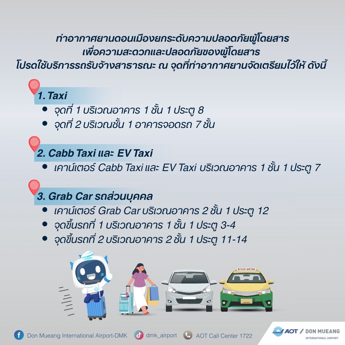 ท่าอากาศยานดอนเมืองกำหนดจุดให้บริการรถรับจ้างสาธารณะ (Pick-Up Points) เพื่อความสะดวกและปลอดภัย โปรดใช้บริการ ณ จุดที่จัดเตรียมไว้ให้ ดังนี้