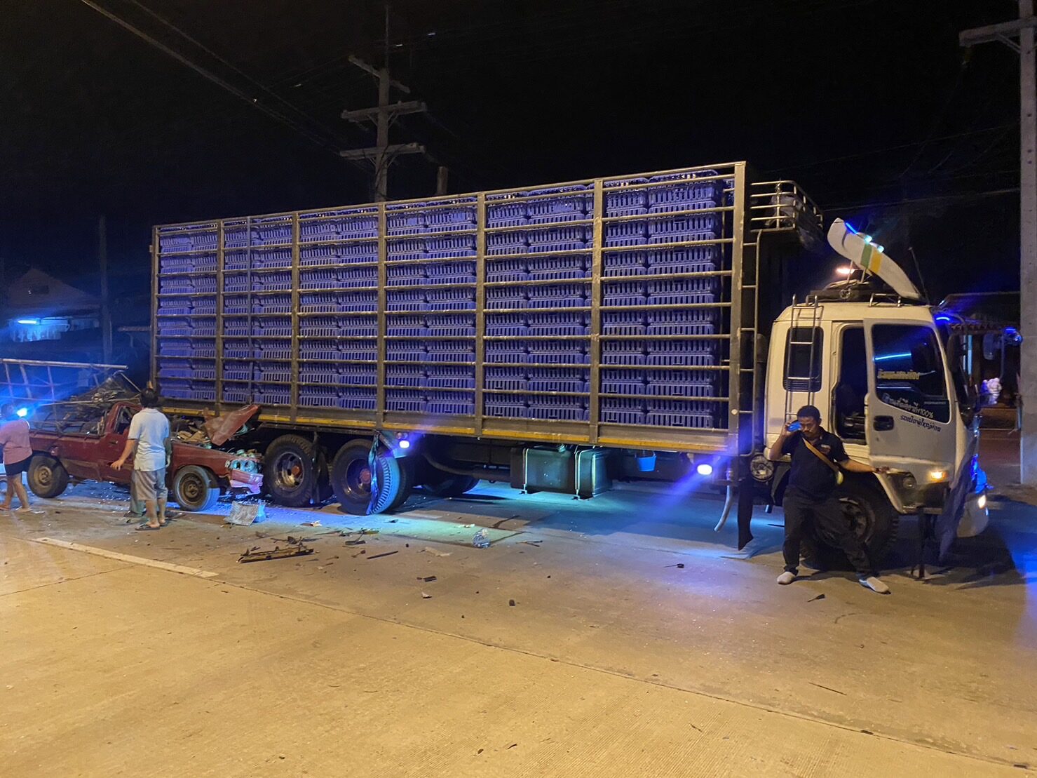 เมื่อเจ้าหน้าที่รุดตรวจสอบที่เกิดเหตุพบว่า รถกะบะตอนเดียว สีแดง ชนท้ายรถบรรทุกขนเป็ด สภาพด้านหน้าพังยับยุบถึงบริเวณคนขับ หลังคาเปิด ตรวจสอบภายในรถพบชาย 1 ราย บาดเจ็บเล็กน้อย นั่งอมยิ้มอยู่บริเวณเบาะด้านหน้ารถหลังพวงมาลัย จึงให้การช่วยเหลือนำตัวออกมาจากตัวรถ เบื้องต้นได้รับบาดเจ็บเพียงเล็กน้อยไม่ประสงค์ไปโรงพยาบาล