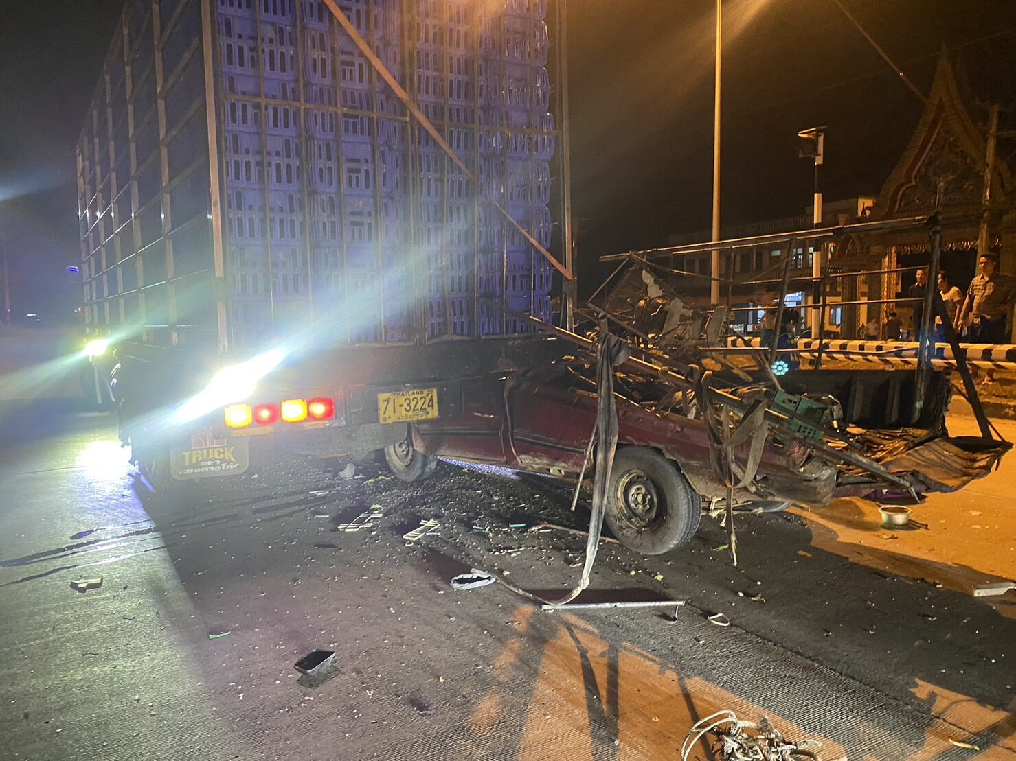 เปิดภาพชายขับกระบะ ชนท้ายบรรทุก รถพังยับ ใครเห็นก็ว่าตาย ตรวจดูเจอนั่งอมยิ้ม