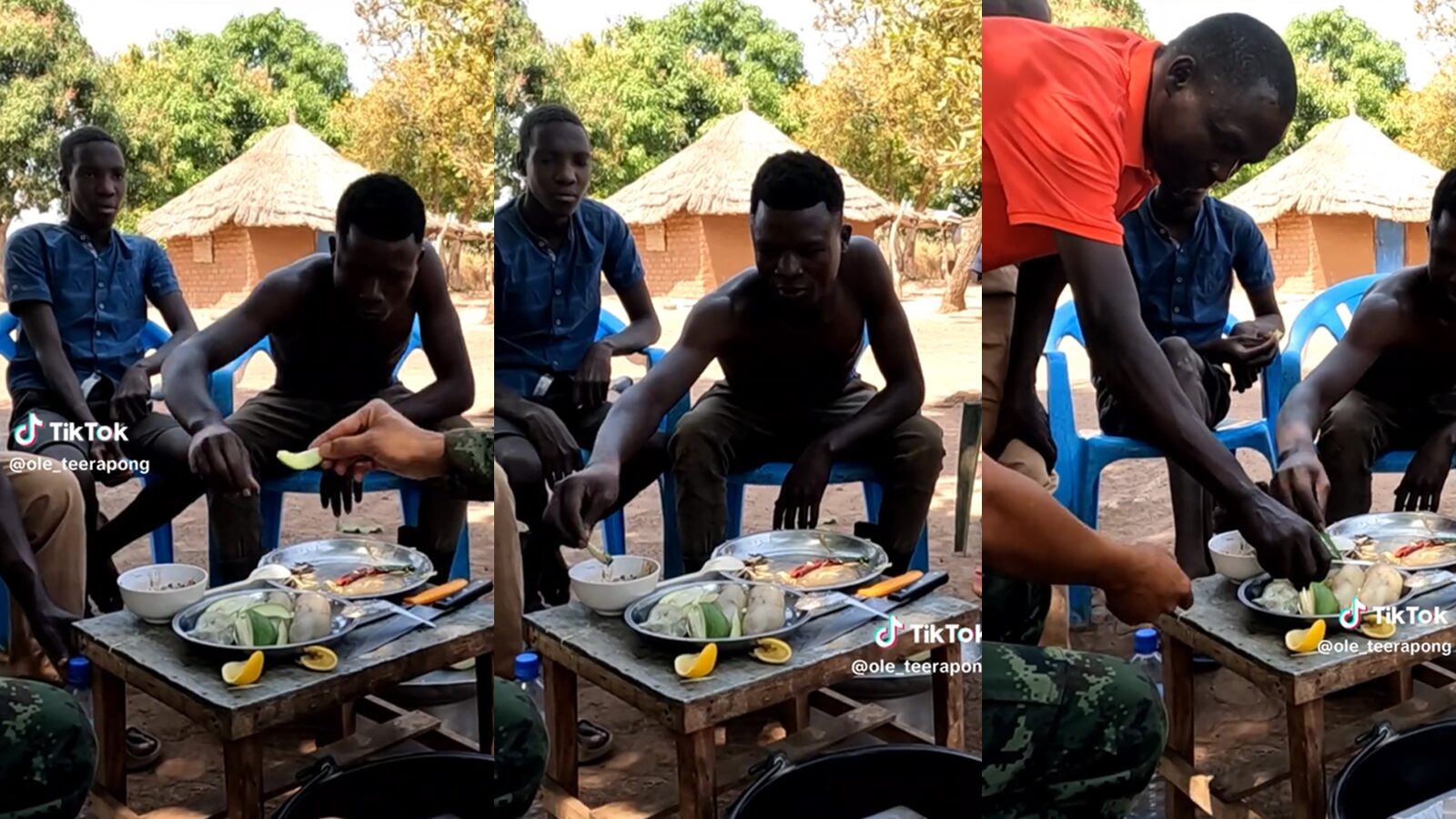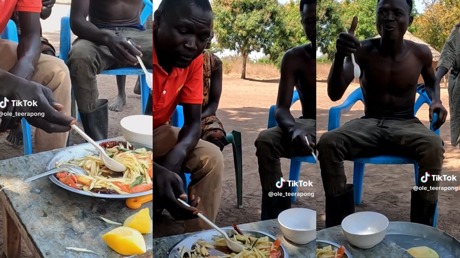 เมื่อวันที่ 19 เมษายน ที่ผ่านมา ผู้ใช้ติ๊กต็อก @ole_teerapong ทหารไทยผู้ไปปฏิบัติภารกิจที่สาธารณรัฐเซาท์ซูดาน หรือซูดานใต้ ได้แบ่งปันวิดีโอขณะที่เขาและชาวซูดานนั่งล้อมวงทาน "ส้มตำ" ด้วยกันอย่างเอร็ดอร่อย เรียกได้ว่าอร่อยจนลืมวางช้อนเลยทีเดียว