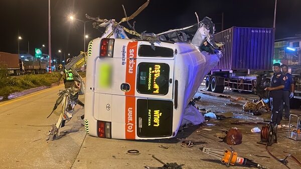 จากนั้นพบว่ามีผู้เสียชีวิตและผู้บาดเจ็บอีก 2 ราย ติดภายในรถตู้ เจ้าหน้าที่ใช้เครื่องตัดถ่างนำร่างของผู้เสียชีวิตออกมาจากตัวรถ ใกล้กันพบรถเทรลเลอร์ 18 ล้อ บรรทุกตู้คอนเทนเนอร์ จอดอยู่บริเวณข้างทาง สภาพล้อหลังหัวรถด้านขวาพังเสียหายจากการถูกเฉี่ยวชน คนขับรถเทรลเลอร์ 18 ล้อ บรรทุกตู้คอนเทนเนอร์ ไม่ได้รับบาดเจ็บ