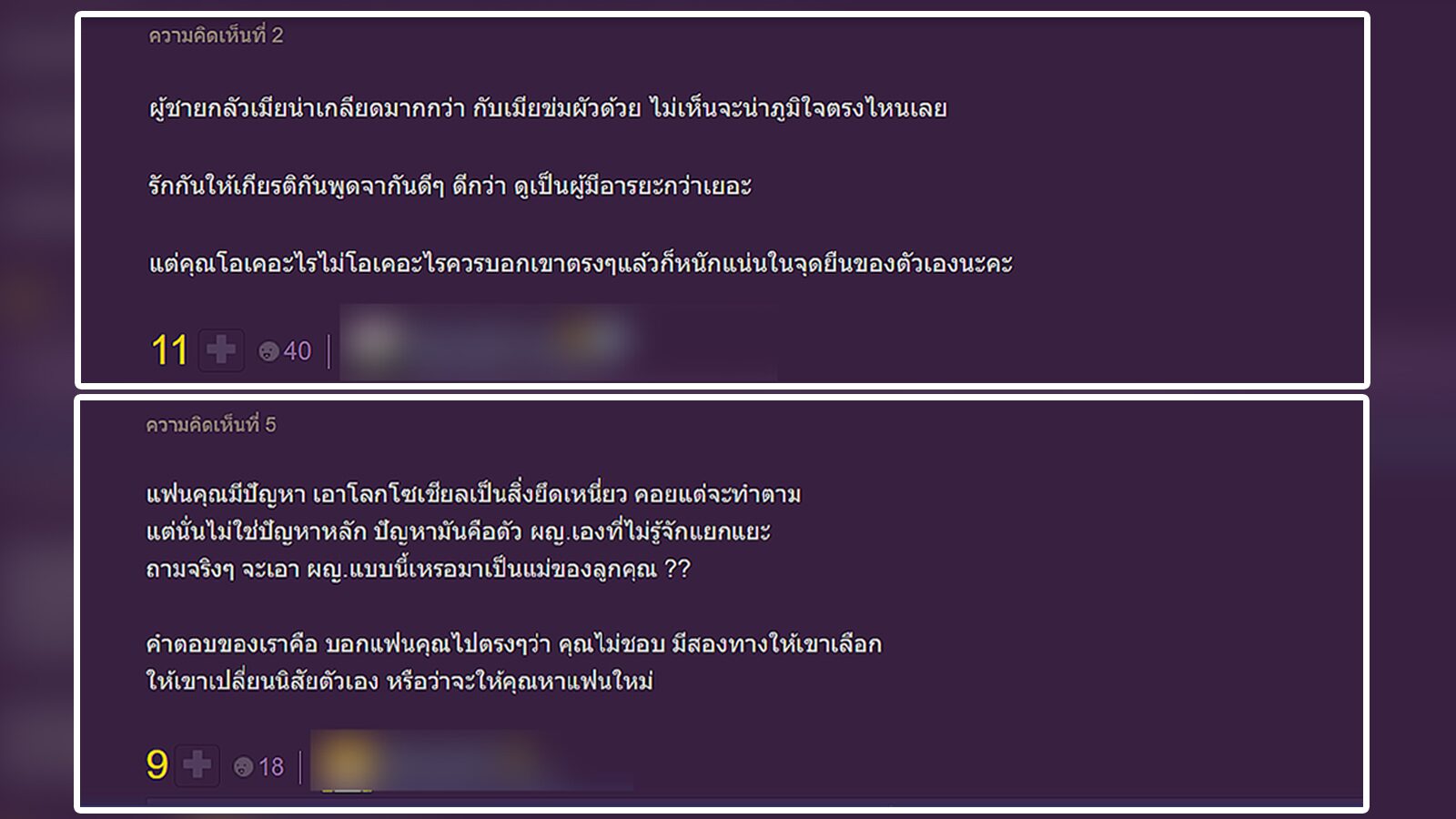 นอกจากนี้ชาวเน็ตยังแนะนำเจ้าของกระทู้ว่า สิ่งใดตักเตือนได้ก็ตักเตือนไป อย่าปล่อยให้มันล้ำเส้นมากนัก ไม่เช่นนั้นชีวิตคู่ของเขาจะไม่มีความสุขอีกเลย