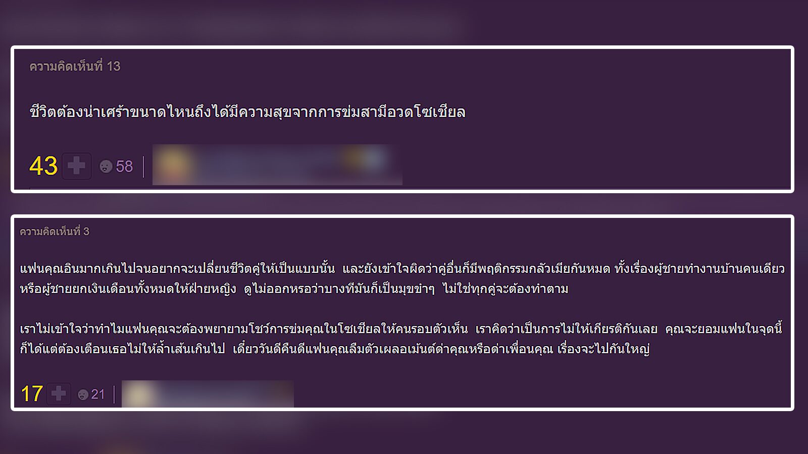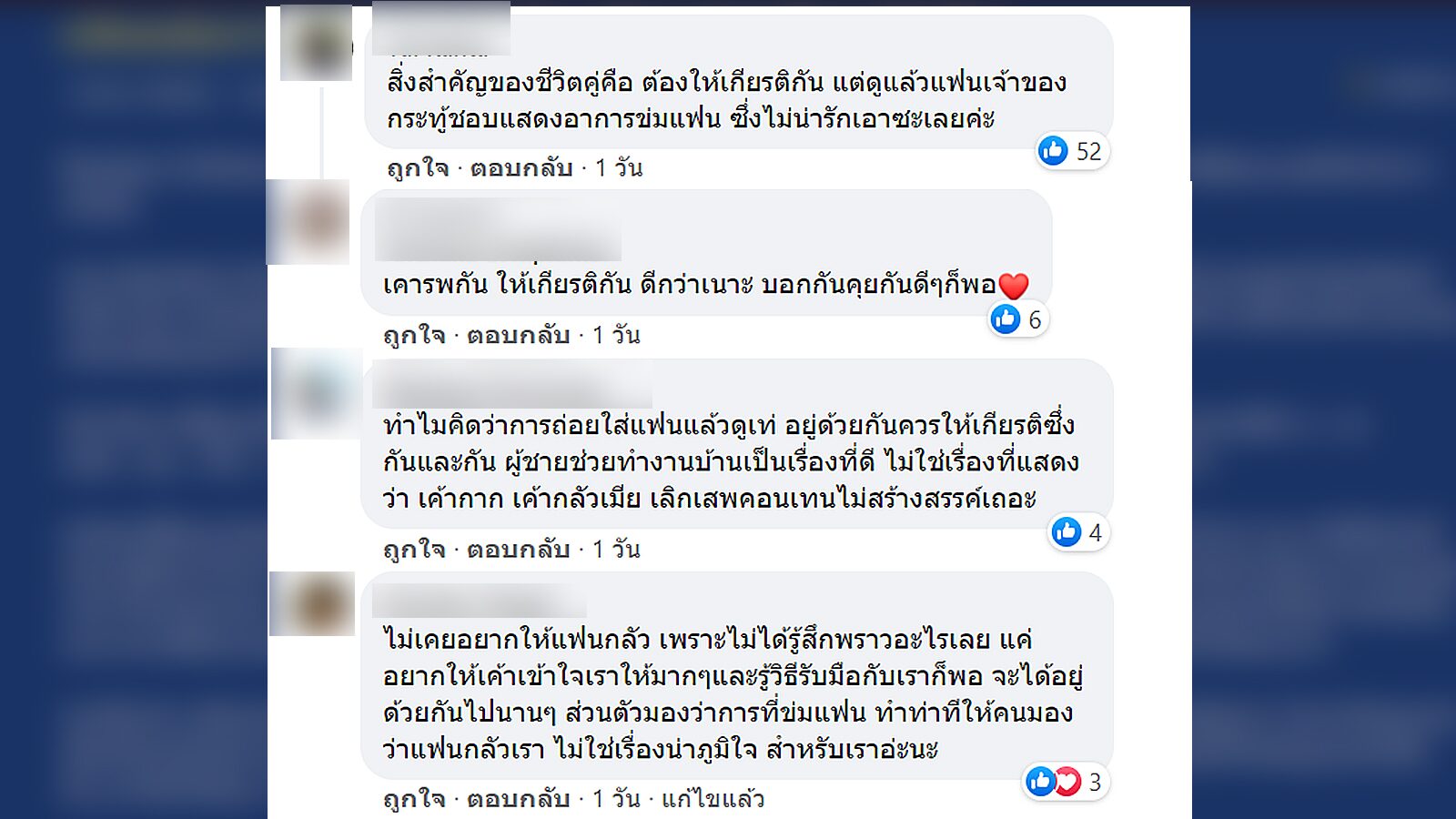 เรียกได้ว่ากระทู้นี้มีชาวเน็ตมาตอบเพียบ ไม่ว่าจะเป็นสายพ่อบ้านหรือแม่บ้าน ส่วนใหญ่พากันติเตียนแฟนสาวว่าเป็นพวกที่อินกับอะไรเกินไป การข่มแฟนบนโซเชียลมันไม่ใช่เรื่องดีนัก แถมยังมองว่าเป็นการไม่ให้เกียรติอีกด้วย