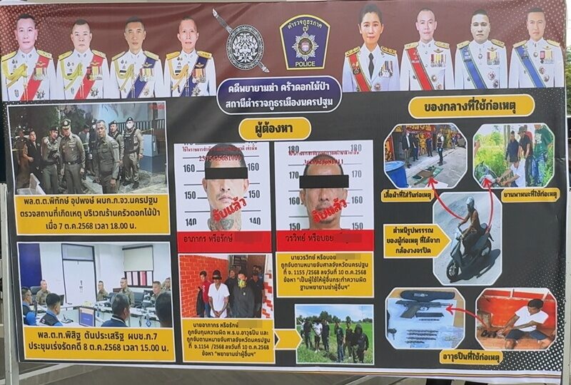 วันที่ 14 ต.ค.68 พล.ต.ท.พิสิฐ ตันประเสริฐ ผบช.ภ.7, พล.ต.ต.ชมชวิณ อุปุระธนานนท์ รอง ผบช.ภ.7, พล.ต.ต.พิพัฒน์ ชุ่มมณีกูล รอง ผบช.ภ.7, พล.ต.ต.ปิติ นฤขัตรพิชัย รอง ผบช.ภ.7, พล.ต.ต.อนันต์ นานาสมบัติ รอง ผบช.ภ.7, พล.ต.ต.ไพศาล พฤกษจำรูญ รอง ผบช.ภ.7, พล.ต.ต.ประสพชัย มัตสยะวนิชกูล รอง ผบช.ภ.7, น.ส.อโรชา นันทมนตรี ผู้ว่าราชการจังหวัดนครปฐม, พล.ต.ต.พิทักษ์ อุปพงษ์ ผบก.ภ.จว.นครปฐม, พ.อ.ภูมิพศุตม์ เตี๊ยะเพชรดี รอง ผอ.รมน.จังหวัด น.ฐ.(ท.) พร้อมด้วยชุดคลี่คลายคดี ร่วมกันแถลงข่าวจับกุมผู้ต้องหาคดีบุกยิง นายระวี อารยวัฒนเวช อายุ 75 ปี หรือเสี่ยเปี๊ยก นักธุรกิจ ได้รับบาดเจ็บสาหัส บริเวณร้านอาหารดอกไม้ป่า ถนนราชมรรคา อ.เมือง จ.นครปฐม เมื่อวันที่ 7 ต.ค.ที่ผ่านมา