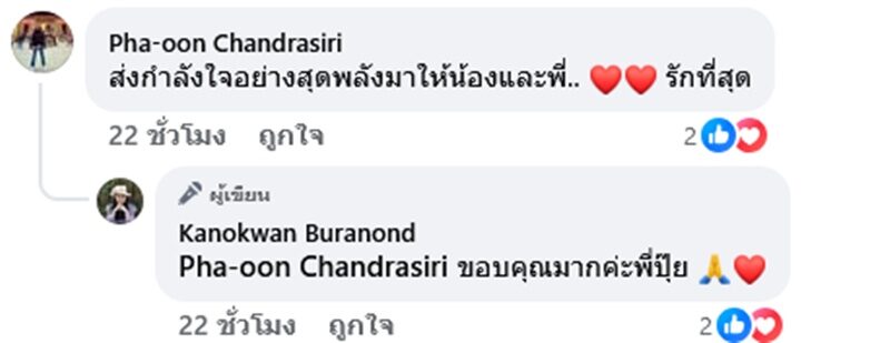 รวมทั้ง ปุ๊ย ผอูน จันทรศิริ ก็มาคอมเมนต์เช่นกันว่า “ส่งกำลังใจอย่างสุดพลังมาให้น้องและพี่.. รักที่สุด” ด้านปูก็ขอบคุณทั้ง ชมพู และ ปุ๊ย ด้วย