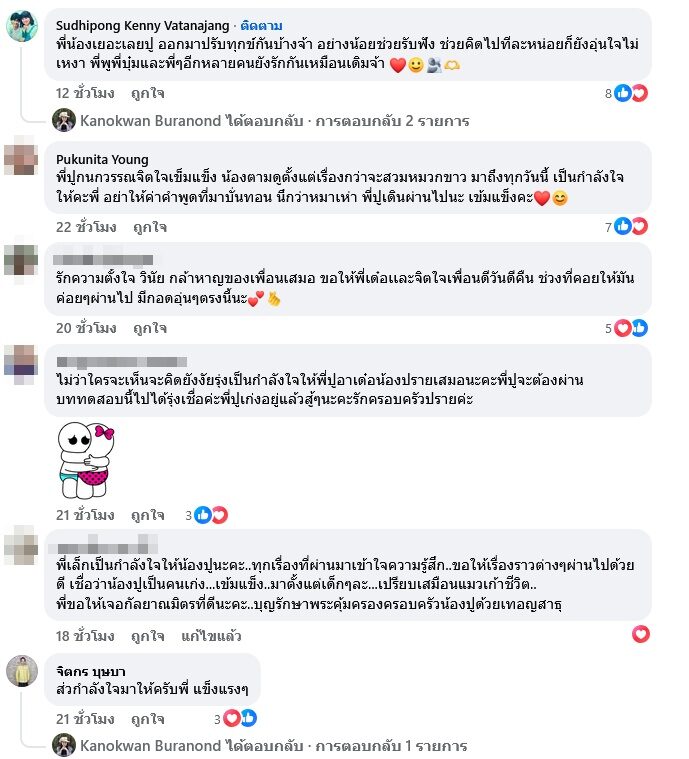 โดยมีทั้งเพื่อนคนบันเทิงและแฟนคลับเข้ามาส่งกำลังใจจำนวนมาก อาทิ ชมพู ฟรุตตี้ ก็คอมเมนต์ส่งกำลังใจด้วยว่า “พี่น้องเยอะเลยปู ออกมาปรับทุกข์กันบ้างจ้า อย่างน้อยช่วยรับฟัง ช่วยคิดไปทีละหน่อยก็ยังอุ่นใจไม่เหงา พี่พูพี่บุ๋มและพี่ๆอีกหลายคนยังรักกันเหมือนเดิมจ้า ”