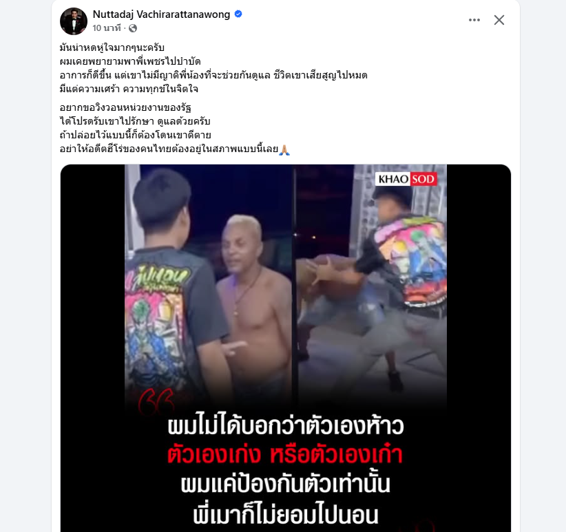 อยากขอวิงวอนหน่วยงานของรัฐ ได้โปรดรับเขาไปรักษา ดูแลด้วยครับ ถ้าปล่อยไว้แบบนี้ก็ต้องโดนเขาตีตาย อย่าให้อดีตฮีโร่ของคนไทยต้องอยู่ในสภาพแบบนี้เลย