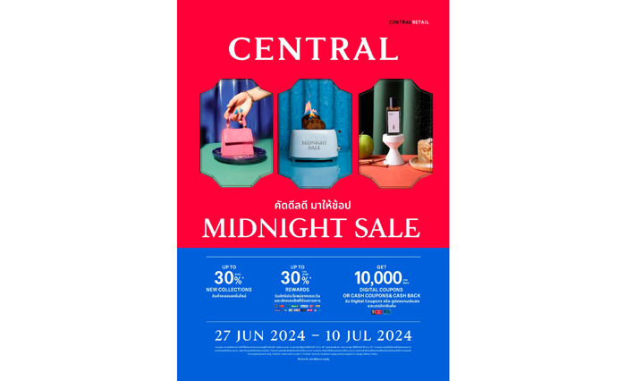 ห้างเซ็นทรัล ในเครือเซ็นทรัล รีเทล เดินเกมรุก! ลุยศึกค้าปลีกแบบไม่มียั้ง ประกาศดึงเม็ดเงินจากนักช้อป – กวาดทราฟฟิคพุ่งตลอดปี ด้วยซิกเนเจอร์แคมเปญ “CENTRAL MIDNIGHT SALE” ครั้งใหม่ #คัดดีลดีมาให้ช้อป ตั้งเป้ายอดขายบวก 1,450 บาท ใน 13 วัน ด้วยจุดแข็ง อาทิ สินค้าคอลเลกชันใหม่เปิดตัวที่แรก มอบส่วนลดสูงสุด 30% แบรนด์ชั้นนำที่มีเฉพาะเซ็นทรัล ซื้อ 1 แถม 1 และโปรสุดเอ็กซ์คลูซีฟอีกมากมายปักธง 25 กันยายน – 7 ตุลาคม 2567 ให้ลูกค้าทุกเจน ทุกสไตล์ ช้อปพร้อมรับสิทธิประโยชน์มากมายในทุกแพลตฟอร์ม
