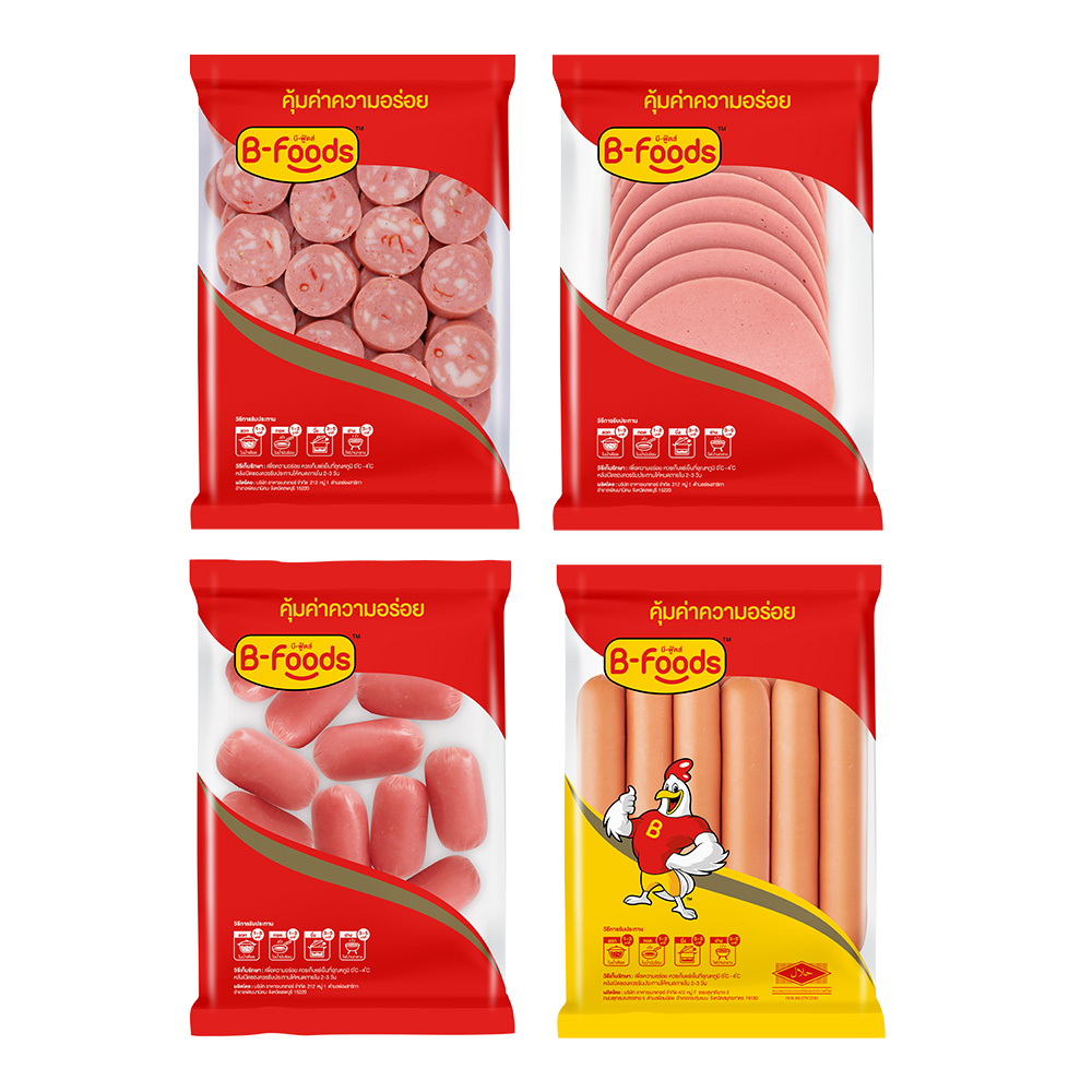 ตัวอย่างสินค้าบี-ฟู้ดส์ เช่น ไก่ยอพริก โบโลญ่า ไส้กรอกคอกเทล ไส้กรอกฮอทดอก[/caption]