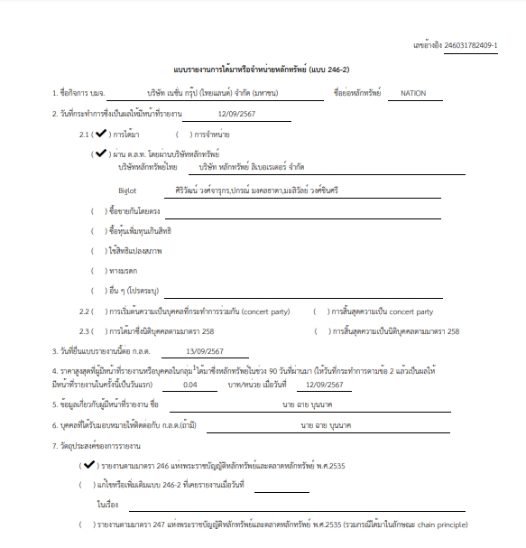 บริษัท เนชั่น กรุ๊ป (ไทยแลนด์) จำกัด (มหาชน) หรือ NATION เปิดเผยว่า ตามสรุปแบบ 246-2 ประจำวันที่ 13 ก.ย.67 โดยสำนักงานคณะกรรมการกำกับหลักทรัพย์และตลาดหลักทรัพย์ (ก.ล.ต.) ได้แจ้งว่า นายฉาย บุนนาค ซึ่งเป็นผู้ถือหุ้นใหญ่อันดับ 6 ได้เข้าซื้อหุ้น NATION ซึ่งเป็นการได้มาเมื่อวันที่ 12 ก.ย.67 โดยจำนวนลักทรัพย์ที่ได้มาจำนวน 624,307,800 หุ้น คิดเป็น 5.1156% ของสิทธิออกเสียงทั้งหมดของกิจการ โดยจำนวนหลักทรัพย์ภายหลังการได้มามีหุ้นจำนวน 1,782,975,042 หุ้น คิดเป็น 14.6098% ของสิทธิออกเสียงทั้งหมดของกิจการและขึ้นแท่นผู้ถือหุ้นใหญ่อันดับ 2
