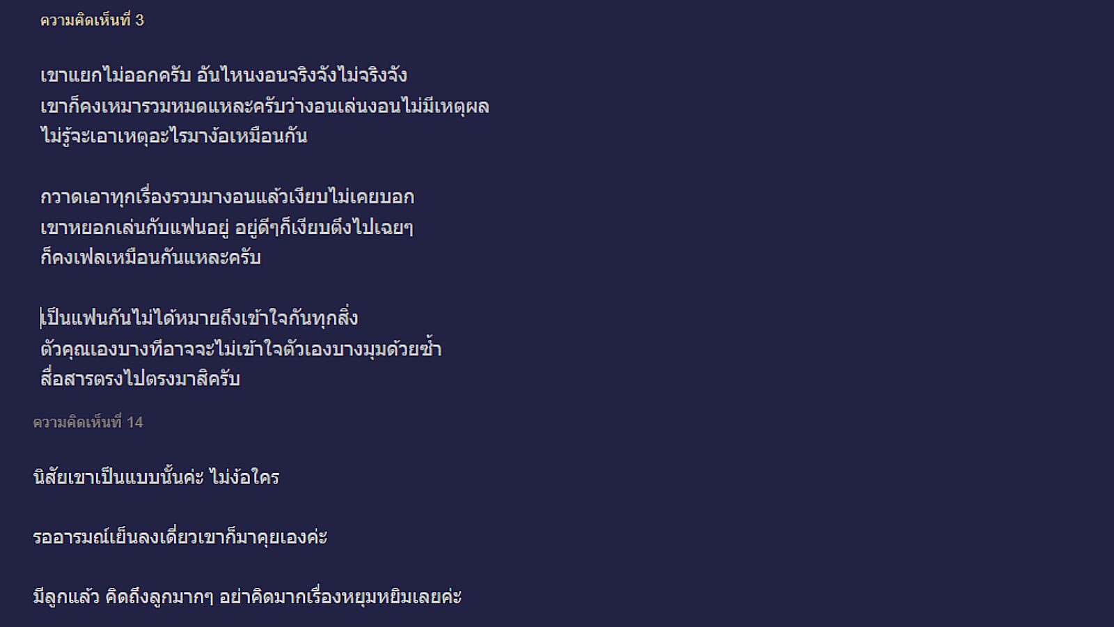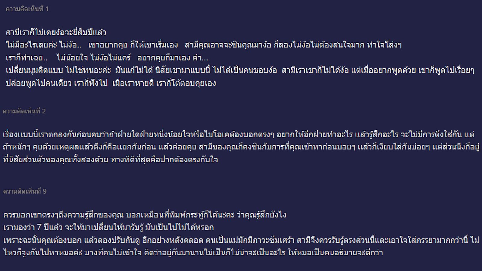 ด้านความคิดเห็นชาวเน็ตได้แนะนำว่า บางทีผู้ชายอาจแยกไม่ออกว่าอันไหนงอนจริงจัง ไม่จริงจัง จึงไม่รู้ว่าจะเอาเหตุอะไรมาง้อ และสามีอาจเคยชินกับการที่เจ้าของกระทู้เป็นฝ่ายเข้าหา จึงอยากให้เจ้าของกระทู้ลองพูดคุยปรับความเข้าใจกับสามี บอกเขาไปตรง ๆ เผื่อว่าสถานการณ์อาจจะดีขึ้น