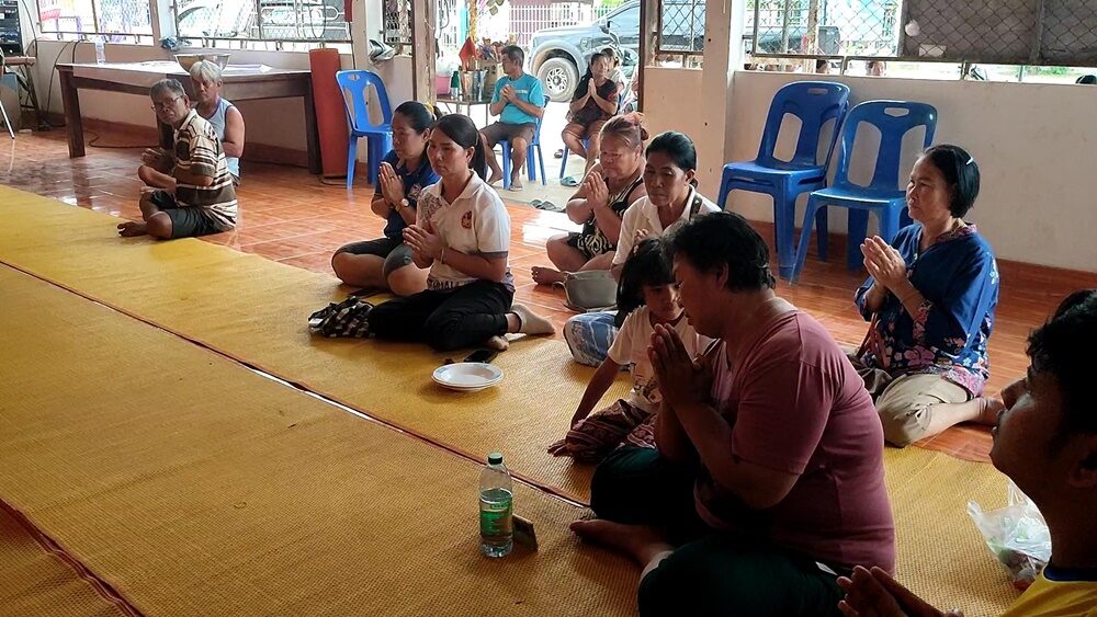 หลังจากนั้น ในตอนเช้าวันรุ่งขึ้นจะมีการสวดมนต์ ทำบุญเลี้ยงพระชาวบ้านจะนำอาหารคาวหวานมาถวายพระ แล้วพระจะสวดมนต์เจริญน้ำพระพุทธมนต์ ปัดเป่าความไม่ดีออกไป เสร็จแล้วจุดธูปเทียน กล่าวส่งทางให้หมดทุกข์ หมดโศกและสิ่งที่ไม่ดีทั้งหลายหมดไป มีแต่สิ่งที่ดีๆเข้ามาในชีวิตเป็นอันเสร็จพิธี ก็จะนำน้ำมนต์ไปดื่มกินแก้โรคภัยและเป็นศิริมงคลภายในครัวเรือนของตน