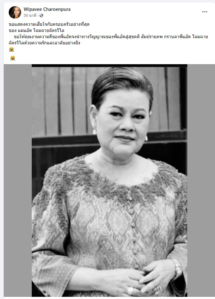 วันที่ 21 มิถุนายน 2567 ผู้สื่อข่าวรายงานว่า เฟซบุ๊ก Wipavee Charoenpura ของ กุ้ง-วิภาวี เจริญปุระ พี่สาวของ “ใหม่ เจริญปุระ” โพสต์ระบุว่า “ขอแสดงความเสียใจกับครอบครัวอย่างที่สุดของ แม่แอ๊ด โฉมฉาย ฉัตรวิไล ขอให้คุณงามความดีของพี่แอ๊ดจงนำทางวิญญาณของพี่แอ๊ดสู่สุขคติ สัมปรายภพ กราบลาพี่แอ๊ด โฉมฉาย ฉัตรวิไล ด้วยความรักและอาลัยอย่างยิ่ง”