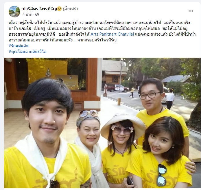 เช่นเดียวกับ ก้อย-ปาริฉัตร ไพรหิรัญ ผู้จัดละคร โพสต์ผ่านเฟซบุ๊ก ระบุว่า “เมื่อวานรู้สึกช็อกไปทั้งวัน แม้ว่าจะพอรู้บ้างว่าแม่ป่วย ขอโทษที่ติดตามข่าวของแม่น้อยไป แม่เป็นคนร่าเริง น่ารัก แจ่มใส เป็นครู เป็นแบบอย่างในหลาย ๆ ด้าน เจอแม่ทีไรจะมีอ้อมกอดอุ่น ๆ ให้เสมอ ขอให้แม่ไปอยู่สรวงสวรรค์อยู่ในภพภูมิที่ดี ขอเป็นกำลังใจให้ Arts Panitnart Chatvilai แม่คงหมดห่วงแล้ว ยังไงก็มีพี่ป้าน้าอารายล้อมมอบความรักให้เสมอนะจ๊ะ…. จากครอบครัวไพรหิรัญ”