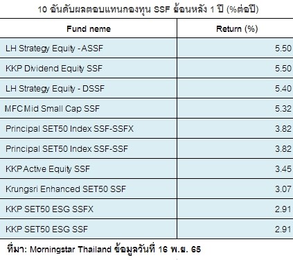 โดยข้อมูล ณ วันที่ 16 พ.ย. 65 สำหรับ 10 อันดับกองทุน SSF ผลตอบแทนระยะยาวสูงสุดย้อนหลัง 1 ปี ได้แก่ กองทุน LH Strategy Equity – ASSF ผลตอบแทน 5.50%, กองทุน LH Strategy Equity– ASSF ผลตอบแทน 5.50%, กองทุน KKP Dividend Equity SSF ผลตอบแทน 5.50%, กองทุน LH Strategy Equity – DSSF ผลตอบแทน 5.40%, กองทุน MFC Mid Small Cap SSF ผลตอบแทน 5.32%, กองทุนPrincipal SET50 Index SSF-SSFX ผลตอบแทน 3.82%