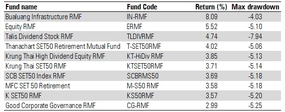 รวมทั้งกองทุน Principal SET50 Index SSF-SSF ผลตอบแทน 3.82%, กองทุน KKP Active Equity SSF ผลตอบแทน 3.45%, กองทุน Krungsri Enhanced SET50 SSF ผลตอบแทน 3.07%, กองทุน KKP SET50 ESG SSFX ผลตอบแทน 2.91% และกองทุน KKP SET50 ESG SSF ผลตอบแทน 2.91%
