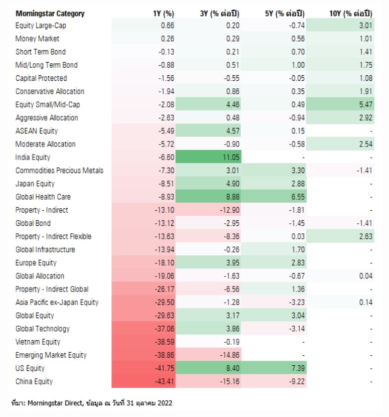สำหรับกองทุน RMF ที่ลงทุนหุ้นไทยขนาดใหญ่มีผลตอบแทนเฉลี่ยสูงสุดในรอบ 1 ปีที่ผ่านมา สะท้อนผลตอบแทนจากการลงทุนหุ้นไทยในปีนี้ที่ถือว่าดีกว่าการลงทุนหุ้นต่างประเทศค่อนข้างมาก เช่นกองทุนหุ้นจีนที่มีผลตอบแทนเฉลี่ย -43.4% หรือหุ้นสหรัฐที่ -41.8% ซึ่งแต่ละตลาดต่างมีปัจจัยเฉพาะที่มีผลกระทบต่อผลตอบแทนจากการลงทุน ขณะที่กลุ่มตราสารหนี้ในประเทศที่แม้จะมีผลตอบแทนติดลบในช่วง 1 ปีที่ผ่านมา แต่ในระยะยาวกองทุนตราสารหนี้ยังเป็นส่วนสำคัญในการจัดพอร์ตการลงทุน