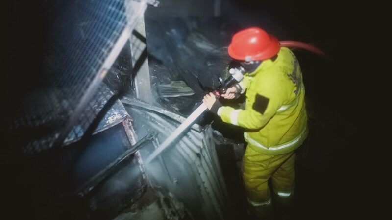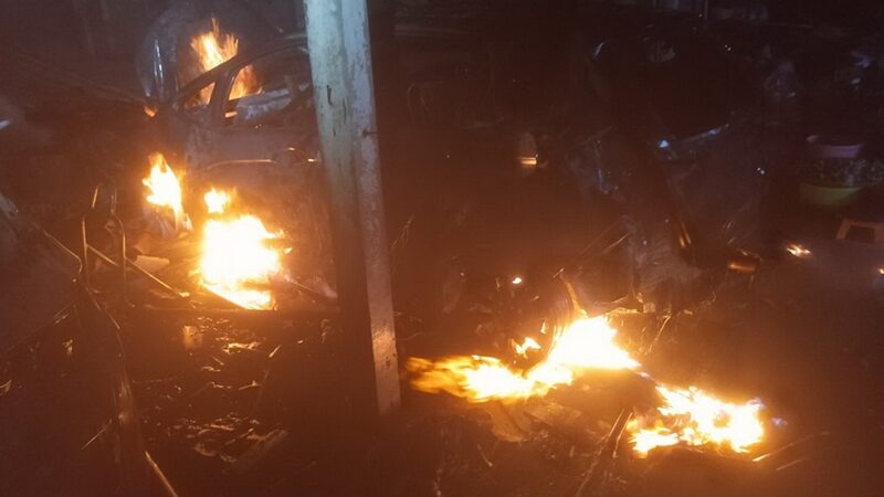 ที่เกิดเหตุพบเพลิงกำลังลุกไหม้โรงจอดรถ และห้องพักคนงาน เจ้าหน้าที่ได้ช่วยกันระดมฉีดน้ำควบคุมเพลิงประมาณ 1 ชั่วโมง เพลิงจึงสงบลง ตรวจสอบพบสินทรัพย์ที่เสียหาย ประกอบด้วย รถยนต์ 2 คัน เป็น รถยนต์ ยี่ห้อฮอนด้า เเจ๊ส และยี่ห้อโตโยต้า ฟอร์จูนเนอร์