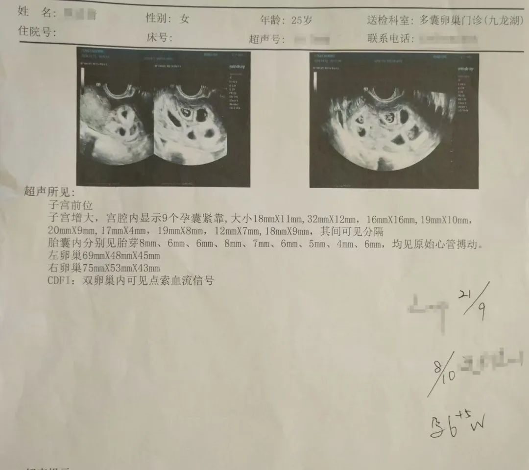 เมื่อวันที่ 12 พฤศจิกายน คุณแม่มือใหม่มาตรวจที่โรงพยาบาลอีกครั้ง ผลการตรวจพบว่ามีถุงตั้งครรภ์ 9 ถุงอยู่ใกล้กันในโพรงมดลูกขนาด 18 มม. ซึ่งแต่ละถุงพบการเต้นของหัวใจแบบปกติในทุกกรณี