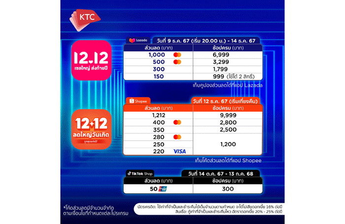 โปรโมชั่นร่วมกับ Shopee ยกระดับประสบการณ์ช้อปปิ้งที่สะดวกสบายไปกับแคมเปญ “Shopee 12.12 ลดใหญ่วันเกิด” โดยสมาชิกบัตรเครดิตเคทีซีและบัตรกดเงินสด “เคทีซี พราว” (KTC PROUD) รับส่วนลด 1,212 บาท เมื่อ ช้อปขั้นต่ำ 9,999 บาทต่อรายการ บัตรเครดิตเคทีซี มาสเตอร์การ์ด และสมาชิกบัตรกดเงินสดเคทีซี พราว มาสเตอร์การ์ด รับส่วนลด 400 บาท เมื่อมียอดซื้อขั้นต่ำ 2,800 บาทต่อรายการ สามารถเก็บโค้ดส่วนลดที่แอป Shopee เฉพาะวันที่ 12 ธันวาคม 2567 เท่านั้น